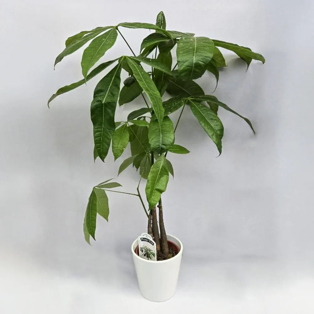 Money Tree Medium: The medium-sized Money Tree reaches approximately 24 inches in height. It’s housed in a 4-inch plastic pot, which is nestled inside a 5-inch ceramic pot. This combination provides a beautiful and balanced look, making it an eye-catching feature in any room.